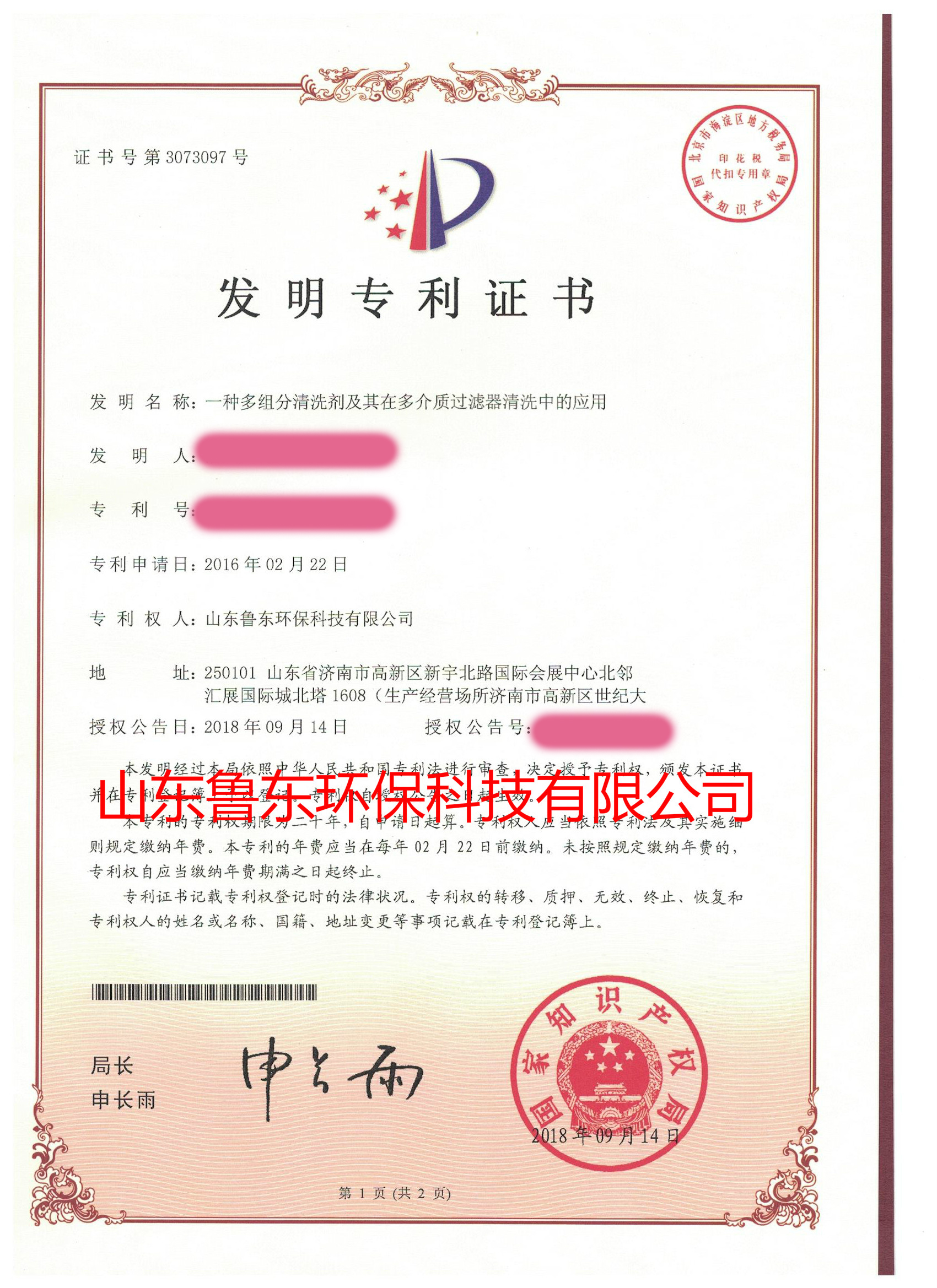 該專利為山東魯東環保科技有限公司技術研發團隊自主研發的成果,體現了公司在水處理藥劑行業創新能力進一步提高,更體現了公司一直以來對水處理藥劑品質的不斷追求。